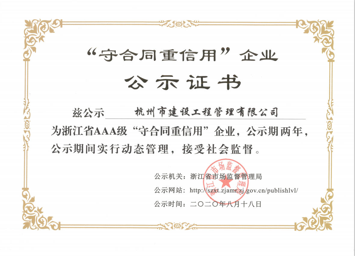 拼搏注册建设工程管理有限公司荣获2020年浙江省AAA级“守合同重信用”公示证书,不仅证实了杭建“不信不立,不诚不行”一诺千金的企业行为,而且证明了杭建人在砥砺前行的道路上工作井然有序与有条不紊,我们将坚持以严谨的工作态度、实事求是、科学公正的立场,致力于招标代理和造价咨询事业。公司全体员工衷心感谢广大新老客户对公司发展的支持和帮助!